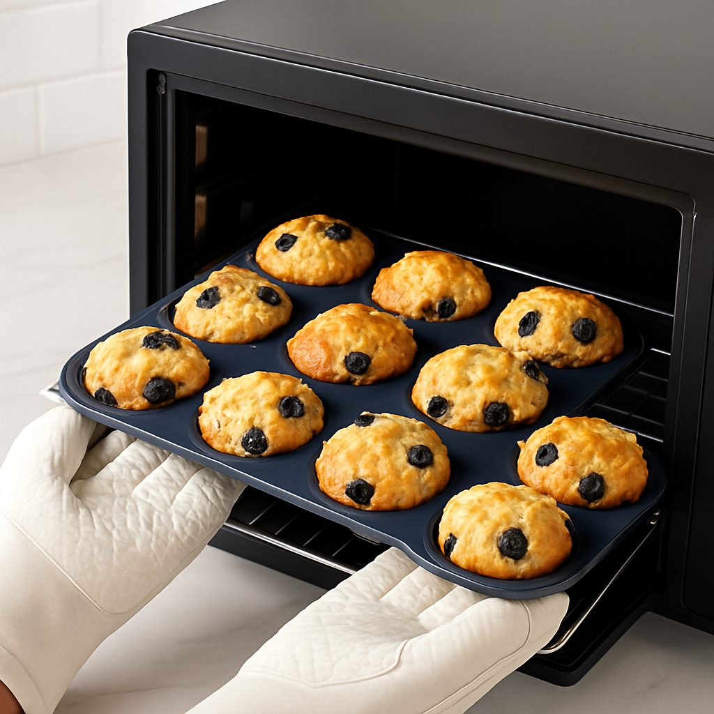 Prepara muffin perfetti ogni volta con questo stampo in silicone alimentare di alta qualità! Dotato di 12 tazze regolari, è ideale per cuocere muffin, cupcake, cioccolatini, tortine e persino mini cheesecake. Realizzato al 100% in silicone certificato FDA, è sicuro, ecologico, resistente alle alte e basse temperature (da -40°C a +240°C) e può essere usato in forno, microonde, lavastoviglie e freezer.