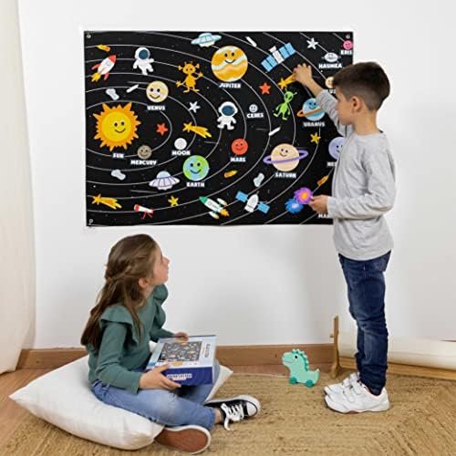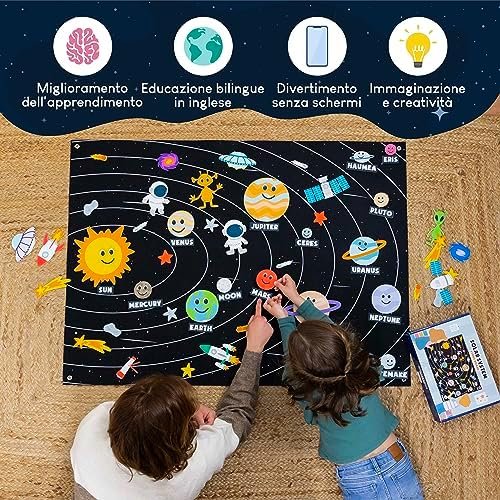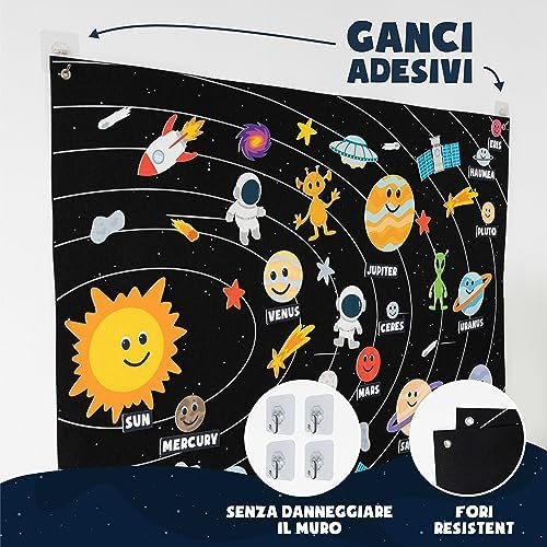 Esplora l’universo insieme ai tuoi bambini con questo straordinario gioco educativo del sistema solare! Il grande pannello in feltro misura 115×83 cm e contiene 61 figure colorate e divertenti, tra cui i pianeti del sistema solare, stelle, razzi, astronauti e molto altro. Ogni elemento è dotato di velcro per essere posizionato e rimosso facilmente, stimolando l’immaginazione e la creatività.