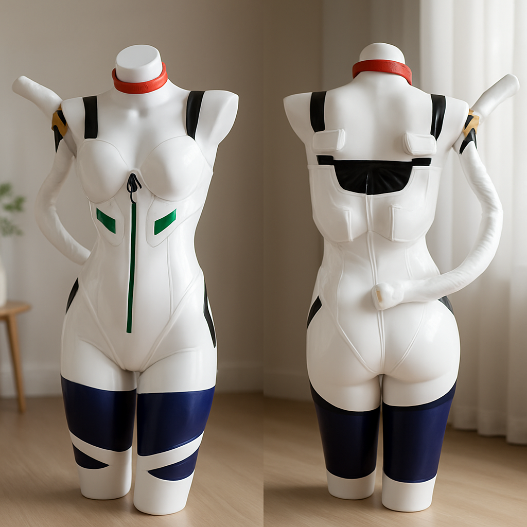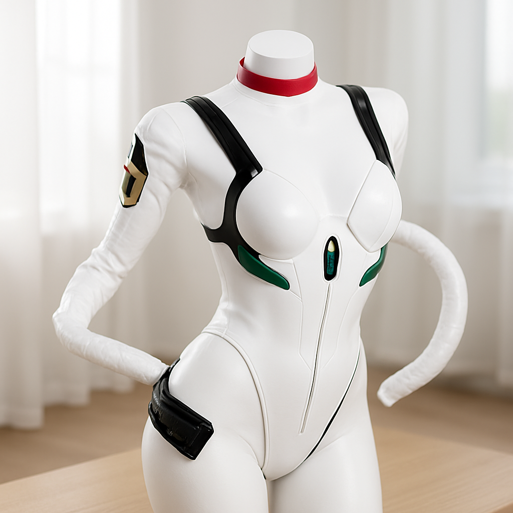 Costume cosplay ispirato al celebre personaggio Rei Ayanami della serie Evangelion, ideale per appassionati di anime, eventi cosplay, fiere, shooting fotografici o feste a tema. Realizzato in tessuto lucido effetto latex, questo body aderente scolpisce la silhouette con eleganza e carattere.
