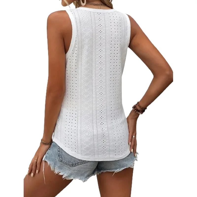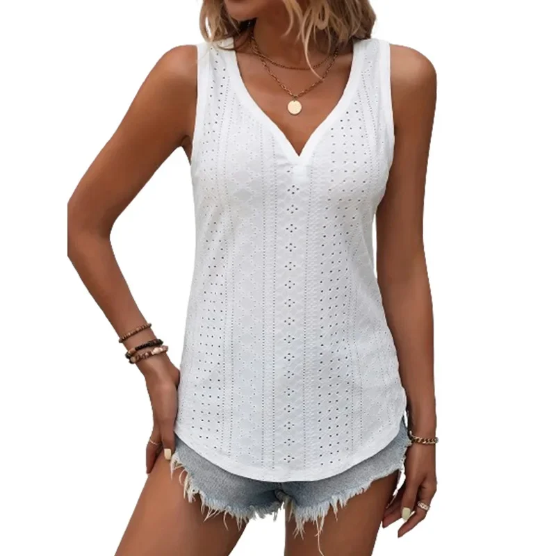 2024 Primavera Estate Nuovo Stile Europeo Americano Cross-border Amazon T-shirt con scollo a V senza maniche Scava Fuori Jacquard Top Vest Donna