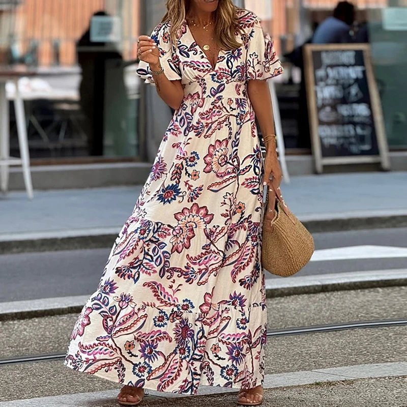 Scrivi la prima recensione per “2025 Summer Street Abito lungo a vita alta Abito casual pieghettato allentato per le vacanze Abbigliamento da donna Abito bohémien con stampa floreale con scollo a V”